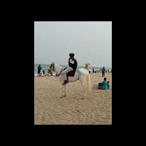 IMAGE2: A young man sits atop a white horse, gazing into the distance, lost in thought. The quiet contrast between him and the lively beach captures a moment of stillness amidst the chaos—where the rhythmic waves echo stories of both solitude and survival.