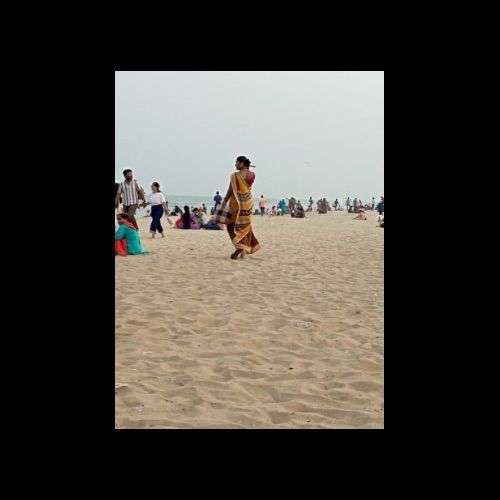 IMAGE1: Amidst the bustling Marina Beach, a lone woman walks with purpose, her sari flowing in the breeze. She carries a bag of essentials, embodying resilience and routine, contrasting the relaxed leisure of beachgoers around her.
